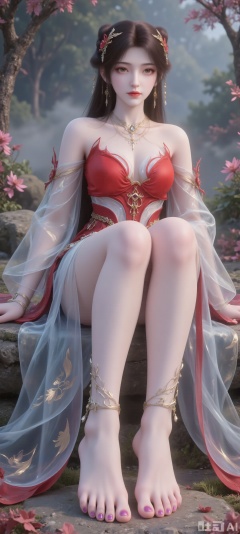 Tip: Masterpiece, best quality, super fine, centered on a girl in red, barefoot, wearing purple nail polish, sitting on the stone, fantasy dress (light blue + gold pattern, off-shoulder, pink and gold shoulder armor), hazy forest background, soft natural light, 3D anime rendering, movie-level composition, 8K