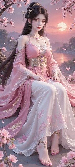 Clothing: She is wearing a pink traditional Chinese dress with classic and elegant style. The dress is off-shoulder design, showing off her beautiful shoulder lines. The upper half of the skirt is pink and has exquisite embroidery and decoration, which looks gorgeous. She wore a golden belt around her waist, decorated with a large gem, adding to the overall sense of nobility. The lower half of the skirt is white with pink embroidery, and the hem is loose and looks very flowing. She also wore a pink shawl, which added to the overall layering.A girl, dancing alone, long hair, simple background, black hair, hair accessories, jewelry, upper body, ponytail, necklace, bracelet, realistic style, wearing difficult clothes, Xiaohuan, a young girl dancing alone, her hair flutters in the wind. She sat there, wearing a ponytail, looking at the audience. She was barefoot, wearing a decorative piece on her feet and purple nail polish on her toes. She sat on a cherry tree, the sun set, and the red sun shone on her.