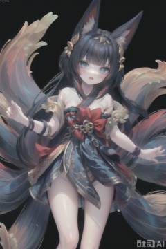 The image depicts a vibrant and fantastical character with a striking appearance. The character is adorned in a flowing, multicolored outfit that resembles a traditional Japanese kimono, featuring intricate patterns and a large, elaborate headdress. The headdress is designed to resemble a fox's head, complete with pointed ears and a small, decorative piece in the center. The character's arms are outstretched, and they are surrounded by a series of large, petal-like appendages that extend outward in a symmetrical pattern, giving the impression of movement or a dance. The background is a solid black, which contrasts sharply with the colorful and detailed design of the character, making them stand out prominently. The overall aesthetic is whimsical and otherworldly, suggesting a connection to fantasy or mythology.solo,1girl,ahri \(league of legends\)
