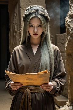 A girl, like a phantom of the ancient ruins, a wraith and an oracle, holds an aged parchment in her hand, with ash - colored hair, long and wispy tresses, an intricate braided coiffure, golden eyes, a glimmer of prophecy in her eyes, and hazy, ethereal special effects behind her. The overall appearance is brown style. Realism