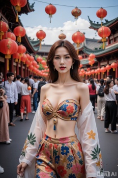 navel, jewelry, lantern, paper lantern, brown hair, breasts, day, earrings, brown eyes, outdoors, crowd, bare shoulders, 1girl, midriff, long hair, architecture, collarbone, solo focus, sky, walking, east asian architecture, shirt, parted lips, cloud, standing, multiple boys, lips, blue sky, multicolored clothes, skirt, white shirt, pants, short sleeps, people, festival, cowboy shot, 6+boys, blurry, street