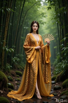1girl, animal print, hand fan, nature, bamboo, high heels, forest, earrings, breasts, solo, jewelry, tiger print, holding, holding fan, long hair, dress, standing, brown hair, outdoors, bamboo forest, full body, folding fan