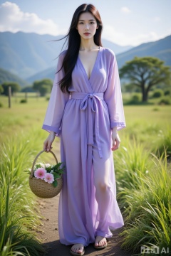 1girl, solo, outdoors, breasts, grass, holding basket, day, standing, holding, basket, long hair, flower, sandals, looking at viewer, brown eyes, robe, brown hair, no bra, lips, full body, see-through, black hair, sky, tree, dress, mountain, purple dress