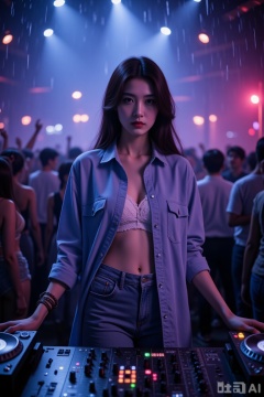 Nightclub girl,1girl, solo,short hair,black hair, navel, brown eyes, hair over one eye,midriff, pants,denim, jeans, realistic,panties,lace panties,white panties, nightclub, lights, dancing, crowd,electronic mixing console during rainfall,blue shirt