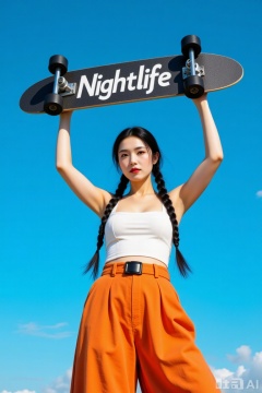 This photo is a highly detailed digital artwork depicting an eye-catching young woman. The young woman with East Asian features stands against a vivid blue sky. She has long black hair tied into two braids that fall down her back. Her makeup is bold, featuring striking red lipstick and heavy eyeliner, giving a dramatic feel. She wears a white vest top that shows off her toned arms and a small tattoo on her left shoulder. Her outfit includes high-waisted loose orange pants, cinched at the waist with a black belt, and she wears unique and chunky white sneakers.