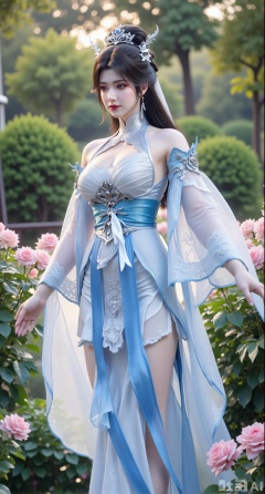 (masterpiece:1.2),best quality,,A woman adorned in traditional Chinese attire,featuring a flowing robe with intricate embroidery and floral accents. A garden filled with pink roses and lush greenery. Soft pastel hues of white,blue,and green,creating a serene atmosphere. Photorealistic photography.,,(huge breasts:2.99),(full breasts:2.99),XyunxiaoYK,Xlonger2,XjiziyeuX2,Xmeifei2,Xtanghezi,XyunyunPVC