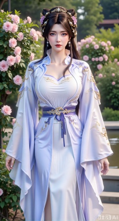 (masterpiece:1.2),best quality,,A woman adorned in traditional Chinese attire,featuring a flowing robe with intricate embroidery and floral accents. A garden filled with pink roses and lush greenery. Soft pastel hues of white,blue,and green,creating a serene atmosphere. Photorealistic photography.,,(huge breasts:2.99),(full breasts:2.99),XyunxiaoYK,Xlonger2,XjiziyeuX2,Xmeifei2,Xtanghezi,XyunyunPVC