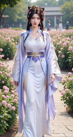(masterpiece:1.2),best quality,,A woman adorned in traditional Chinese attire,featuring a flowing robe with intricate embroidery and floral accents. A garden filled with pink roses and lush greenery. Soft pastel hues of white,blue,and green,creating a serene atmosphere. Photorealistic photography.,,(huge breasts:2.99),(full breasts:2.99),XyunxiaoYK,Xlonger2,XjiziyeuX2,Xmeifei2,Xtanghezi,XyunyunPVC