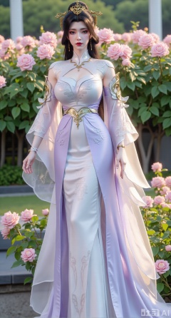 (masterpiece:1.2),best quality,,A woman adorned in traditional Chinese attire,featuring a flowing robe with intricate embroidery and floral accents. A garden filled with pink roses and lush greenery. Soft pastel hues of white,blue,and green,creating a serene atmosphere. Photorealistic photography.,,(huge breasts:2.99),(full breasts:2.99),XyunxiaoYK,Xlonger2,XjiziyeuX2,Xmeifei2,Xtanghezi,XyunyunPVC