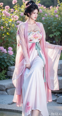 (masterpiece:1.2),best quality,,A woman adorned in traditional Chinese attire,featuring a flowing robe with intricate embroidery and floral accents. A garden filled with pink roses and lush greenery. Soft pastel hues of white,blue,and green,creating a serene atmosphere. Photorealistic photography.,,(huge breasts:2.99),(full breasts:2.99),XyunxiaoYK,Xlonger2,XjiziyeuX2,Xmeifei2,Xtanghezi,XyunyunPVC