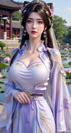 (masterpiece, best quality:1.2),1girl, navel, solo, midriff, bare shoulders, hair ornament, flower, hair flower, black hair, red lips,BREAK, (looking at viewer:1.39), chinese clothes,(Holographic long dress:1.39), (lace,Rainbow Gradient Color:1.29),BREAK,purple eyes,blurry, solo focus, long hair, lips, daytime, lipstick, outdoors, (upper body,,Long legs:1.29), blurry,(huge breasts,full breasts:2.41), background, 1girl, makeup, hair bun,(Blue sky:1.39),(Suzhou Garden Lotus Pond,lotus,Lotus Leaf:1.39),(huge breasts:2.99),(full breasts:2.99),(Background with traditional Chinese architecture, lotus pond and lotus flowers:1.39),XyunxiaoYK,Xlonger2,XjiziyeuX2,Xmeifei2,Xtanghezi,XyunyunPVC
