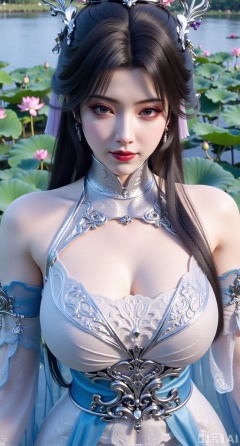 (masterpiece, best quality:1.2),1girl, navel, solo, midriff, bare shoulders, hair ornament, flower, hair flower, black hair, red lips,BREAK, (looking at viewer:1.39), chinese clothes,(Holographic long dress:1.39), (lace,Rainbow Gradient Color:1.29),BREAK,purple eyes,blurry, solo focus, long hair, lips, daytime, lipstick, outdoors, (upper body,,Long legs:1.29), blurry,(huge breasts,full breasts:2.41), background, 1girl, makeup, hair bun,(Blue sky:1.39),(Suzhou Garden Lotus Pond,lotus,Lotus Leaf:1.39),(huge breasts:2.99),(full breasts:2.99),(Background with traditional Chinese architecture, lotus pond and lotus flowers:1.39),XyunxiaoYK,Xlonger2,XjiziyeuX2,Xmeifei2,Xtanghezi,XyunyunPVC