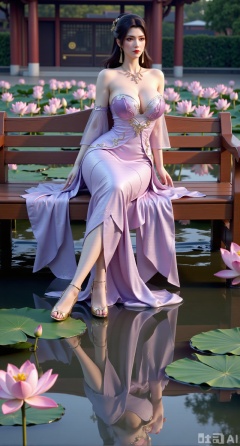 (masterpiece:1.2),best quality,The image is a digital illustration of a young woman sitting on a wooden bench in a pond with lily pads. She is wearing a long dress with design on the chest and sleeves. The dress has a high neckline and short sleeves,Holding a lotus in hand. She has long dark hair styled in loose waves and is wearing gold high heels. The woman is posing with one hand on her hip and the other resting on the edge of the bench. The background is filled with pink and white lotus flowers and green leaves. The overall mood of the image is peaceful and serene,(huge breasts:2.99),(full breasts:2.99),(Background with traditional Chinese architecture, lotus pond and pink lotus flowers:1.39),,XyunxiaoYK,Xlonger2,XjiziyeuX2,Xmeifei2,Xtanghezi,XyunyunPVC