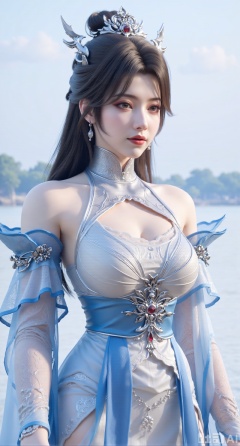 masterpiece, best quality, 1girl,solo,looking at viewer,( outdoor:1.3),sea,beach,realistic,midriff,bare shoulders,standting,hair ornament,long hair,jewelry,long dress,cowboy shot, (huge breasts, full breasts:2.69),Xbaozhiyinhuaqun,Xlonger,Xxiaoli,Xtangheziqun,Xyunyunshouban