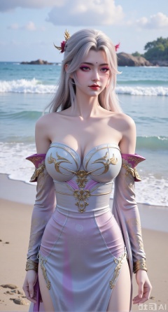 masterpiece, best quality, 1girl,solo,looking at viewer,( outdoor:1.3),sea,beach,realistic,midriff,bare shoulders,standting,hair ornament,long hair,jewelry,long dress,cowboy shot, (huge breasts, full breasts:2.69),Xbaozhiyinhuaqun,Xlonger,Xxiaoli,Xtangheziqun,Xyunyunshouban