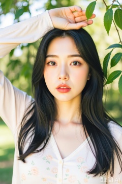 1girl, solo, long hair, looking at viewer, shirt, black hair, long sleeves, white shirt, upper body, outdoors, parted lips, day, black eyes, arm up, lips, leaf, floral print, sunlight, plant, red lips