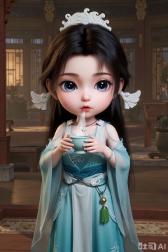 1girl, chibi, cute, little girl, SY, 3D, She is dressed in a flowing, light blue and white gown that appears to be made of delicate fabric, with intricate patterns and a green pendant hanging from her waist. Her attire is complemented by a necklace and a headpiece adorned with white, leaf-like designs. Her hair is long and dark, styled with two white, wing-like accessories.In the ancient Chinese architectural house, holding tea cups with both hands, the tea cups were emitting smoke, and the girl used her mouth to blow away the heat of the tea