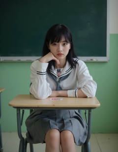 A photograph of a young Asian woman with straight black hair and bangs, sitting at a desk in a classroom. She wears a traditional Japanese schoolgirl uniform: a white blouse with black trim, a grey pleated skirt, and a grey necktie. Her expression is neutral, and she rests her chin on her right hand, which is touching her cheek. The classroom background features green walls and a blackboard on the left. The desk has a Japanese flag sticker. The overall mood is contemplative and slightly melancholic.
