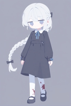 ƎWꓤOꓞWI,1girl,braid,solo,dress,black dress,long hair,grey background,long sleeves,full body,blue eyes,shoes,blue ribbon,bow,collared dress,black footwear,hair bow,blood,ribbon,pantyhose,looking at viewer,neck ribbon,simple background,black bow,mary janes,arms at sides,expressionless,very long hair,no mouth,white hair,standing,white pantyhose,walking,no sclera,no nose,floating hair,french braid,blood on clothes,puffy sleeves,closed mouth,dot mouth,blunt bangs,sleeves past wrists,braided ponytail,puffy long sleeves,gradient eyes,blue bow,heel up,grey hair,black ribbon,jitome,no lineart,