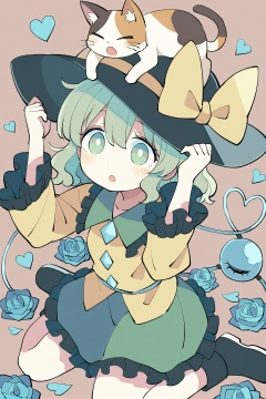 loli,(masterpiece,best quality,highres,absurdres,best quality,amazing quality,very aesthetic,absurdres),1girl, blue flower, komeiji koishi, blue rose, frills, green skirt, skirt, hat, rose, flower, shirt, heart, cat, third eye, green eyes, black headwear, heart of string, long sleeves, solo, animal on head, yellow shirt, wide sleeves, frilled sleeves, on head, green hair, hat bow, bow, frilled skirt, open mouth, frilled shirt collar, ribbon, sitting, black footwear, yellow ribbon, boots, yellow bow, hat ribbon, full body, diamond button, wariza, blouse, buttons, wavy hair, medium hair, cat on head, calico, blush, bright pupils, simple background, short hair, collared shirt, hands on headwear, eyeball, hair between eyes, animal, white pupils, :o, brown background, hands up