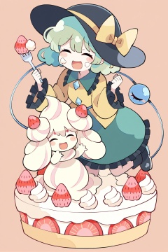 loli,(masterpiece,best quality,highres,absurdres,best quality,amazing quality,very aesthetic,absurdres),alcremie, strawberry, food, komeiji koishi, fruit, hat, closed eyes, yellow shirt, green hair, skirt, open mouth, shirt, third eye, long sleeves, holding, fork, smile, pokemon (creature), frills, green skirt, cake, black headwear, holding fork, yellow bow, hat bow, simple background, food on face, bow, cream, frilled sleeves, wide sleeves, happy, :d, yellow ribbon, 2girls, frilled shirt collar, black footwear, buttons, blush stickers, blush, ^_^, multiple girls, ribbon, hat ribbon, brown background, medium hair, diamond button, short hair, frilled skirt, collared shirt, 1girl