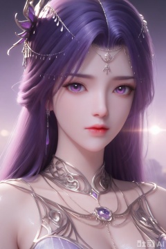 1girl, solo, long hair, looking at viewer, hair ornament, dress, jewelry, closed mouth, purple eyes, upper body, purple hair, shiny, necklace, shiny hair, expressionless,Semi_Realistic,