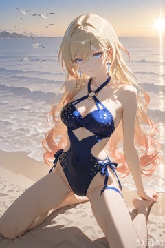 Masterpiece, (Exquisite Wallpaper Art: 1), (Bianka "Durandal" Ataegina from Honkai: Star Rail: 1), Front View, Breathtaking Coastal Scenery – golden sandy beach stretching to the horizon, soft waves lapping the shore with glistening foam, warm golden sunlight filtering through the air, distant seagulls gliding over the sea. 1 Elegant Young Woman with striking presence: long, silky platinum-blonde hair cascading over her shoulders and down to her lower back, strands tousled gently by the sea breeze, subtle sun-kissed highlights at the ends; ice-blue eyes (classic trait of Bianka) with sharp, piercing gaze that holds a hint of noble disdain, eyelashes slightly curled, a faint smirk curving her lips – playful yet composed. Clad in a provocative yet elegant bikini swimsuit: top with tied straps and delicate beaded embroidery along the edges, bottom with a high-cut design accented by golden sequins that catch the light; detailed close-up of the swimwear reveals texture – smooth satin fabric blending with subtle metallic sheen. Bare feet resting gently on warm, fine sand: toes slightly splayed, sand grains clinging softly to the soles. Graceful kneeling pose: one knee bent, left leg extended slightly behind, hips tilted to the side, back straight – showcasing her balanced, athletic figure; full-body composition emphasizing her proportional beauty: slender waist, defined shoulders, long legs that flow seamlessly from the hip. Sophisticated mature beauty with impeccable proportions: skin with a healthy glow, collarbones subtly defined, arms toned but not overly muscular; presence that commands attention – a blend of warrior-like poise and feminine elegance.