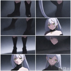 1girl, long hair, looking at viewer, bangs, hair ornament, gloves, dress, green eyes, full body, ponytail, white hair, boots, black gloves, black footwear, multiple views, concept art
