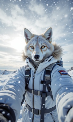 (realistic arctic fox in expedition suit:1.3), anthropomorphic animal, standing tall on snow dune, blizzard winds, fading sun behind clouds, (far selfie perspective:1.2), camera held high, capturing entire silhouette against glowing white sky, snow swirling, cinematic frozen drama, photorealistic fur and snow detail, ultra-detailed, 8k, masterpiece, heroic survival tone