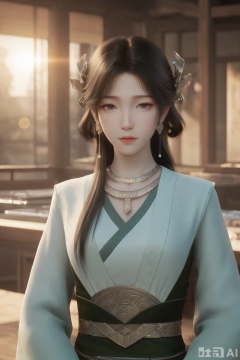 1girl, solo, long hair, looking at viewer, brown hair, black hair, hair ornament, jewelry, closed mouth, upper body, earrings,necklace,chinese clothes,, expressionless,indoors,Semi_Realistic,