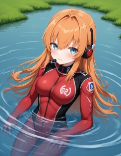 a character with long orange hair wearing a red and black suit with the number '02' prominently displayed. the character appears to be submerged in water with only their head and upper body visible above the water's surface. the background shows a calm water body surrounded by green grass.,1girl,plugsuit,solo,realistic,red bodysuit,bodysuit,interface headset,partially submerged,looking at viewer,long hair,pilot suit,orange hair,water,breasts,lips,hair between eyes,blue eyes,nose,wet,science fiction,skin tight,upper body,souryuu asuka langley