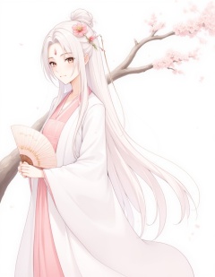 hanfu,chinese clothe,1girl,long hair,solo,white hair,forehead mark,dress,branch,facial mark,holding,hand fan,cherry blossoms,chinese clothes,hair ornament,flower,looking at viewer,white dress,hair bun,from side,holding fan,pink dress,jewelry,closed mouth,upper body,
