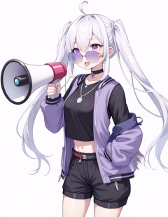 1girl, megaphone, solo, tongue, holding megaphone, sunglasses, jewelry, twintails, open mouth, earrings, tongue out, tinted eyewear, white hair, long hair, black shirt, holding, purple-tinted eyewear, shorts, choker, jacket, black shorts, long sleeves, shirt, belt, blue-tinted eyewear