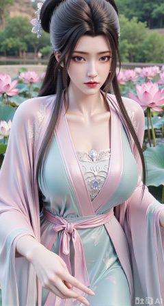 (masterpiece, best quality:1.2),1girl, navel, solo, midriff, bare shoulders, hair ornament,(long hair),(High double ponytail:1.49), red lips, BREAK, (looking at viewer:1.39), chinese clothes,(Holographic pink|green dress:1.36), (lace,Rainbow Gradient Color:1.28), BREAK,blurry, solo focus, long hair, lips, daytime, lipstick, outdoors, standing,upper body,(huge breasts:2.89), background, solo, makeup,(Liquid glass style flowers:1.49),(huge breasts:2.99),(full breasts:2.99),,(Background with lotus pond and pink lotus flowers:1.39),Xbaozhiyinhuaqun,Xlonger,Xxiaoli,Xtangheziqun,Xyunyunshouban,Xfengmian,XluxueqishuiyiY