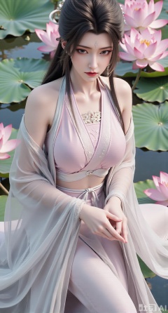 (masterpiece, best quality:1.2),1girl, navel, solo, midriff, bare shoulders, hair ornament,(long hair),(High double ponytail:1.49), red lips, BREAK, (looking at viewer:1.39), chinese clothes,(Holographic pink|green dress:1.36), (lace,Rainbow Gradient Color:1.28), BREAK,blurry, solo focus, long hair, lips, daytime, lipstick, outdoors, standing,upper body,(huge breasts:2.89), background, solo, makeup,(Liquid glass style flowers:1.49),(huge breasts:2.99),(full breasts:2.99),,(Background with lotus pond and pink lotus flowers:1.39),Xbaozhiyinhuaqun,Xlonger,Xxiaoli,Xtangheziqun,Xyunyunshouban,Xfengmian,XluxueqishuiyiY