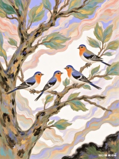 bai,an abstract vintage painting with birds on a branch in a tree, muted colors in the style of Renoir painter, beautiful brushstrokes, happy mood and cheerful atmosphere. 20K, high resolution, ultra high definition, rich details and sharp outlines.