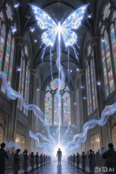 bai,a white butterfly shaped light shines down from the sky, surrounded by stained glass windows, anime aesthetic style, dark blue and gold, Yuumei, a large church with gothic architecture, fantasy illustrations, made of crystal, shining in darkness, renaissance oil painting portraits, dark background, shining on people, dark black background, mysterious, luminous, holy lights, sacred feeling, fantasy. The background is dark blue and yellow. The scene includes flying butterflies.