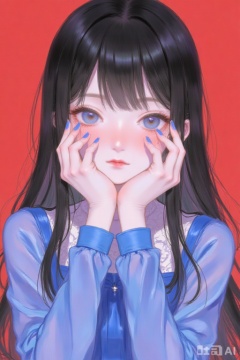 bai,original,long hair,bangs,1girl,blunt bangs,looking at viewer,black hair,blue nails,sfw,blue eyes,solo,hands on own face,hands up,eyebrows visible through hair,hands on own cheeks,long sleeves,long fingernails,blue dress,fingernails,dress,upper body,red background,blue dress,simple background,very long hair,parted lips,