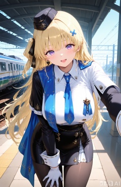 masterpiece,best quality,high quality, 1girl,feibi,blonde hair,long hair, purple eyes,loves,long hair,white gloves,pantyhose,breasts,skirt,white shirt,blue necktie,necktie,shirt,jacket,black jacket,very long hair,train,hat,train station,long sleeves,looking at viewer,open mouth,smile,leaning forward,hair between eyes,collared shirt,black skirt,large breasts,bangs,belt,pencil skirt,black headwear,solo,garrison cap,:d,blush,uniform,black pantyhose,ground vehicle,armband,hand on own thigh,solo focus,
