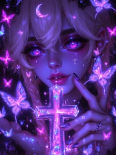 This digital artwork features a mystical, ethereal scene with a close-up of a pale-skinned, androgynous figure with striking purple eyes and blonde hair. They hold a glowing, cross-shaped crystal, surrounded by sparkling butterflies and a crescent moon. The background is a dreamy, neon-lit purple, enhancing the otherworldly atmosphere.