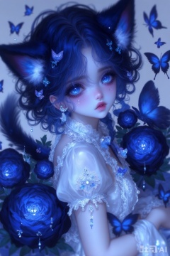 1girl,navy blue hair, long wavy curl hair, no bangs, light blue eyes, white lace dress, blue cat ears, white tip on left ear, long deep blue cat tail, teardrop mole under right eye, dark blue roses, blue butterflies, ethereal background, soft magical lighting, delicate fantasy aesthetic, half-body shot, front view, best quality, masterpiece,