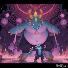 The image depicts a vibrant and colorful scene with a central character that resembles a stylized dinosaur or reptile wearing a hoodie. The character has a large belly, green spikes on its arms, and a friendly expression. It is surrounded by a futuristic, glowing environment with a mix of purple and blue hues. In the background, there are two other smaller characters, one on the left and one on the right, both with blue skin and spiky hair. They appear to be engaged in some form of activity, possibly dancing or performing. The ground is illuminated with green and yellow lights, creating a dynamic and lively atmosphere. The overall setting suggests a digital or virtual world, possibly from a video game or animated series.choncc\(league of legends\),dragon,furry,choncc\(league of legends\)