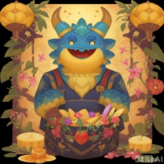 The image depicts a cheerful, anthropomorphic creature resembling a honey badger, with a large smile and horns. It is surrounded by various honey products, including honeycombs, honey cakes, and honey-themed items like a basket filled with fruits and a honeycomb structure. The background is a bright, clear blue sky with a few clouds, giving a sense of a sunny day. The overall scene is whimsical and playful, with a focus on honey and nature.choncc\(league of legends\),dragon,furry