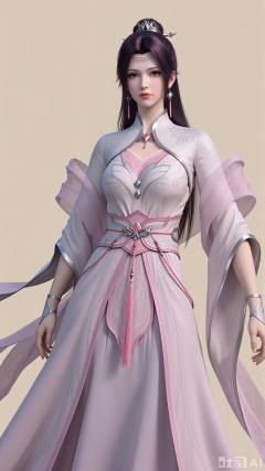 Realistic style, close-up of the upper body, one girl, delicate hands, single figure, long hair, jewelry, black hair, earrings, dress, pink dress, hair accessories. Blue eyes, eyelashes, delicate eyes, hair bun, Chinese-style clothing, crown, single hair bun, forehead ornament, waist belt, necklace, purple hair, pink dress, wide sleeves. Real, pure beige background. Bright. Full of natural light. Light and shadow.