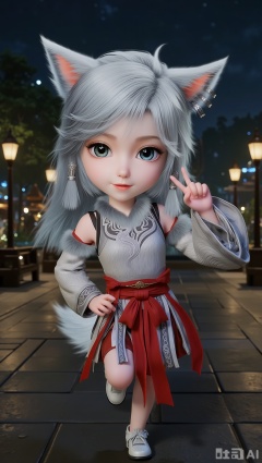 1girl, chibi, cute, little girl,full body,white shoes,Different colored pupils, one blue and one green, YINYUE, 3D, a character with long, flowing silver hair and pointed ears, resembling a fox or wolf. The character is wearing a detailed, intricate silver outfit with fur accents on the shoulders and chest. The outfit features a pattern that resembles scales or feathers, giving it a fantasy-like appearance. The character also has a pair of silver earrings.dressed in a traditional outfit with intricate patterns, a white blouse with puffed sleeves, and a red sash tied around the waist.In the city square at night,One hand supports the waist, while the other raises a V-sign,One foot is raised, looking very playful and cute