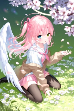 cherry_blossoms, heterochromia, 1girl, solo, pink_skirt, open_cardigan, skirt, neckerchief, animal_ears, sailor_collar, cardigan, halo, thighhighs, wings, hair_ornament, school_uniform, pleated_skirt, petals, blue_eyes, serafuku, flower, white_sailor_collar, green_eyes, black_thighhighs, long_sleeves, :o, hair_flower, looking_at_viewer, grass, shirt, open_clothes, pink_neckerchief, sitting, angel_wings, pink_hair, falling_petals, brown_cardigan, white_shirt, feathered_wings, hair_between_eyes, nail_polish, blush, ahoge, arm_up, outdoors, white_wings, zettai_ryouiki