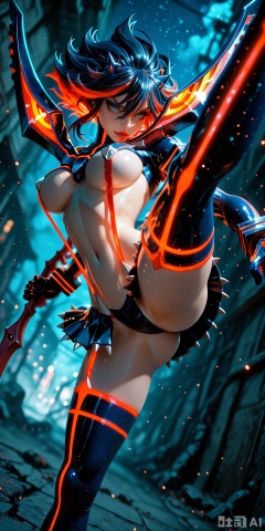 masterpiece, best quality, 1girl, solo, absurdres, large breasts, matoidg, attack, fighting stance, barefoot, night, science fiction, dutch angle, ducking under a high kick, barely avoiding impact, intense close-up,, glowing, light particles, blurry background, embedding:crisp,MATOIDG.,BLUE EYES, BLACK HAIR, RED HAIR,MULTICOLORED HAIR, THIGHBOOTS,SUSPENDERS, REVEALING CLOTHES,ARMOR,MICRO SKIRT.,HYPER-DETAILED,3D,,MATOIDG., INTRICATE, SOFT SHADING,DETAILED TEXTURES