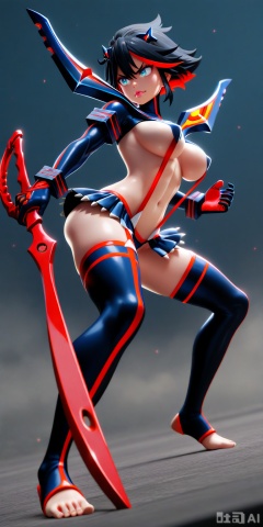 sword, barefoot, toeless legwear, wardrobe malfunction, night, science fiction, from side, blocking a kick with forearm, defensive stance, determined scowl,, glowing, light particles, blurry background,:SmoothQuality,MATOIDG.,BLUE EYES, BLACK HAIR, RED HAIR,MULTICOLORED HAIR, THIGHBOOTS,SUSPENDERS, REVEALING CLOTHES,ARMOR,MICRO SKIRT.,MATOIDG.,DETAILED, INTRICATE, SOFT SHADING,DETAILED TEXTURES,MATOIDG.,HYPER-DETAILED,3D,