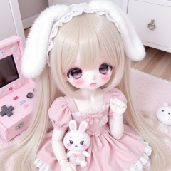 This is a digital illustration of a cute anime-style doll with a pastel aesthetic. The doll has long, straight, platinum blonde hair with a soft, silky texture, and large, expressive, pinkish-grey eyes with a gentle, innocent look. Her cheeks are blushed with a light pink hue, adding to her adorable appearance. She wears a white lace headband with fluffy bunny ears protruding from it. Her outfit consists of a pink, puffy-sleeved dress with a heart-shaped bow at the center, and a white lace trim along the neckline and sleeves. She also wears white bunny-shaped pigtails on either side of her head. In her right hand, she holds a small white stuffed bunny with a smiling face. The background features a pink gaming console with various buttons and a small screen, a white bed with a pink blanket, and a wooden floor. The overall color palette is soft and pastel, emphasizing a cute and whimsical theme. The style of the illustration is highly detailed and realistic, with a focus on soft textures and gentle colors.