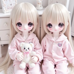 This digital artwork features two identical porcelain dolls with large, expressive eyes and soft pink blush on their cheeks. Both dolls have long, straight, platinum blonde hair with bangs. They are wearing matching pastel pink, button-up pajamas with a small, embroidered heart on the left side of their chests. The doll on the right is holding a small, white, plush teddy bear with black embroidered eyes and a pink ribbon around its neck. The background consists of a light-colored wooden floor and a white, minimalistic piece of furniture with a rounded, textured ornament on top. The overall color palette is soft and pastel, enhancing the delicate and innocent appearance of the dolls. The lighting is even, creating a gentle and soothing atmosphere. The dolls' skin is smooth and pale, contributing to their delicate and lifelike appearance. The style of the artwork is highly realistic, with a focus on creating a sense of innocence and purity.